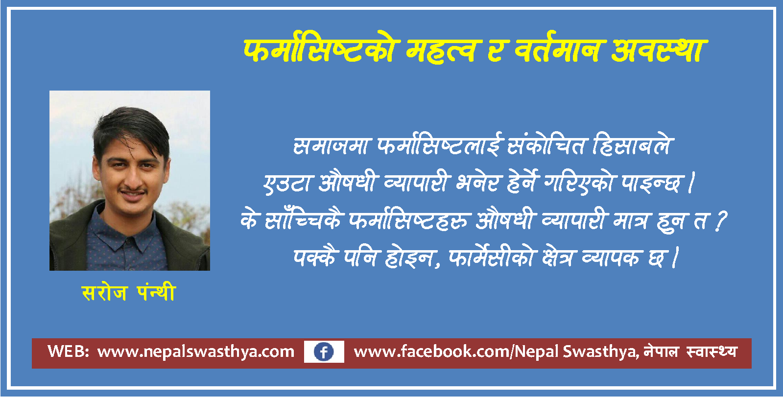 फार्मेसी भन्नाले औषधिको छनोट, पहिचान, विश्लेषण, औषधीय प्रभाव, विशक्तत्ता, तयारी, प्रयोग, निषेध र वितरणको साथै व्यापारिक तथा कानुनी पक्षहरुको समेत अध्ययनलाई जनाउँछ । विश्वमा स्वास्थ्य क्षेत्रको अत्यन्त सम्मानित एवं संवेदशनशील क्षेत्र हो, फार्मेसी पेसा । औषधी बिनाको स्वास्थ्य क्षेत्र वा उपचार सम्भव पनि छैन र कल्पना गर्न पनि सकिदैन । खोपलाई समेत जोडेर हेर्दा औषधी नचाहिने मानिस नै छैनन् । बच्चा गर्भमा रहेदेखि जन्मिएर पूरा जीवन कटाई मृत्युवरण गर्दासम्म हामी औषधीको सहयोग लिई रहेको हुन्छौं । अनि त्यही औषधीसंग प्रत्यक्ष सरोकार राख्ने व्यक्ति हुन फर्मासिष्ट अर्थात औषधी विज्ञ । समाजमा फर्मासिष्टलाई संकोचित हिसाबले एउटा औषधी व्यापारी भनेर हेर्ने गरिएको पाइन्छ । के साँच्चिकै फर्मासिष्टहरु औषधी व्यापारी मात्र हुन त ? पक्कै पनि होइन, फार्मेसीको क्षेत्र व्यापक छ । जस्तै कम्युनिटी फार्मेसी, इन्डस्ट्रियल फार्मेसी, मार्केटीङ्ग फार्मेसी, एकेडेमिक फार्मेसी आदी ।