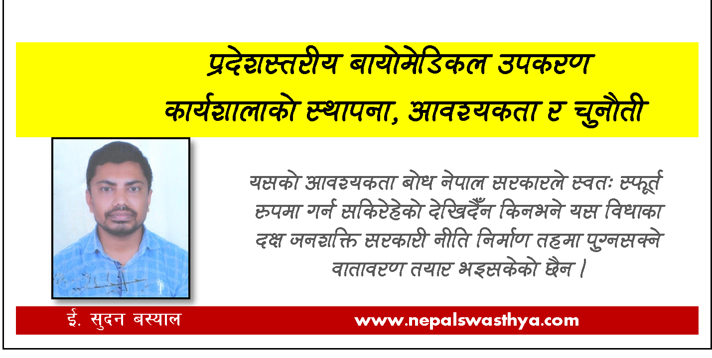 हालै लुम्बिनी प्रदेशस्थित देवदह नगरपालिकामा उद्घाटन गरिएको बायोमेडिकल उपकरण कार्यशाला देशकै दोस्रो ठुलो र नमुना कार्यशाला भएको छ भने यसअघि सुदुरपश्चिम प्रदेशमा स्थापना भई सञ्चालनमा आईसकेको छ त्यस्तै गण्डकी प्रदेशमा पनि उद्घाटन गरिसकिएको परिपेक्षमा कार्यशालाको काम कारबाही र औचित्य भने प्रस्ट्याउन सम्बन्धित निकायलाई अझै गृहकार्य गर्नुपर्ने देखिन्छ । यसको आवश्यकता बोध नेपाल सरकारले स्वतः स्फूर्त रुपमा गर्न सकिरेहेको देखिदैँन किनभने यस विधाका दक्ष जनशक्ति सरकारी नीति निर्माण तहमा पुग्नसक्ने वातावरण तयार भइसकेको छैन तर पनि केही प्रदेशमा यसको अवधारणा विकास भइरहेको छ । सरकार तथा सरोकारवालाहरुलाई यसको आवश्यकता र महत्वका बारेमा स्वास्थ्य सम्बन्धी काम गर्ने विभिन्न संस्थाहरुले सहयोग पुर्याईरहेको देख्न सकिन्छ ।