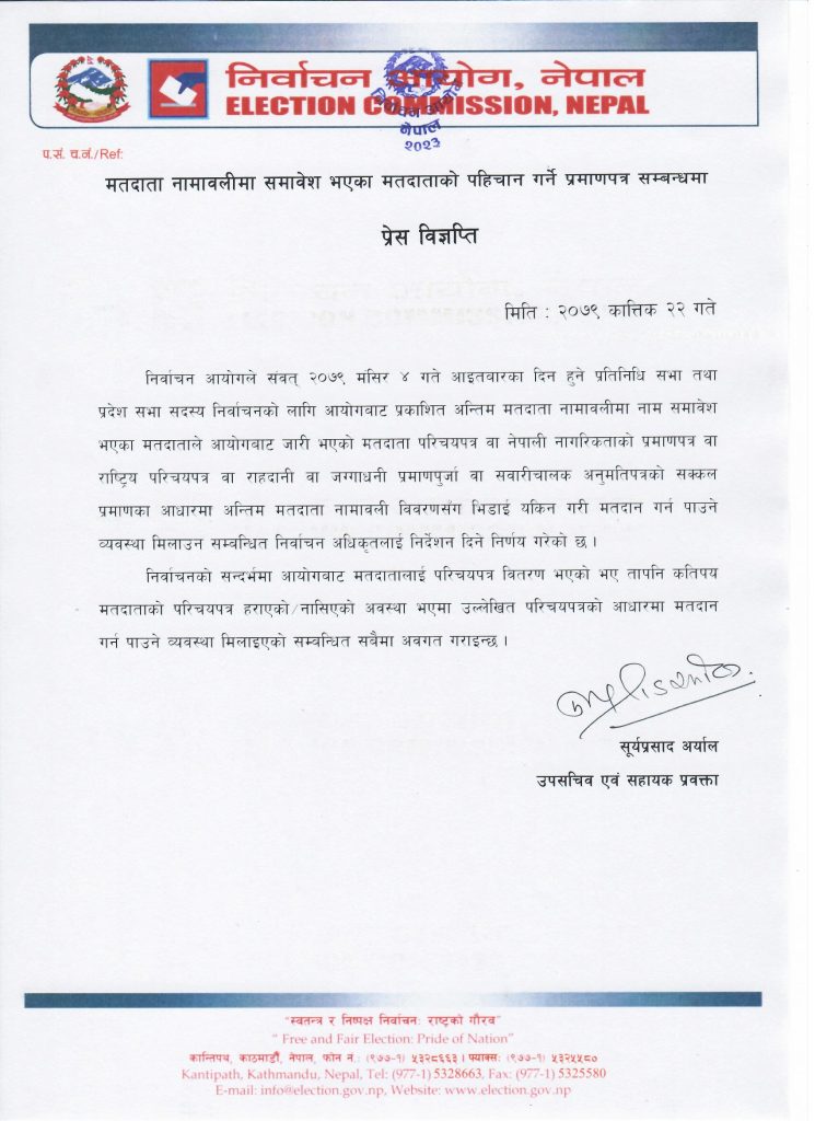 आगामी मंसिर ४ गते हुन गइरहेको प्रतिनिधि सभा र प्रदेश सभाको चुनावमा मतदाताले मतदाता परिचयपत्रको अलवा नेपाली नागरिकताको प्रमाणपत्र वा राष्ट्रिय परिचयपत्र वा राहदानी वा जग्गाधनी प्रमाणपुर्जा वा सवारीचालक अनुमतिपत्रको सक्कल प्रमाणका आधारमा अन्तिम मतदाता नामावली विवरणसँग भिडाई यकिन गरी मतदान गर्न पाइने भएको छ ।