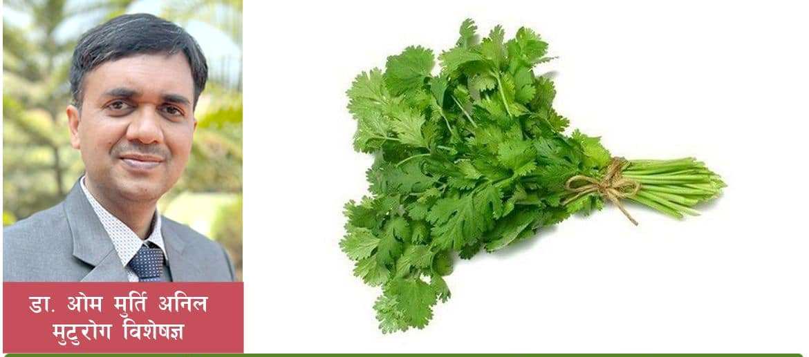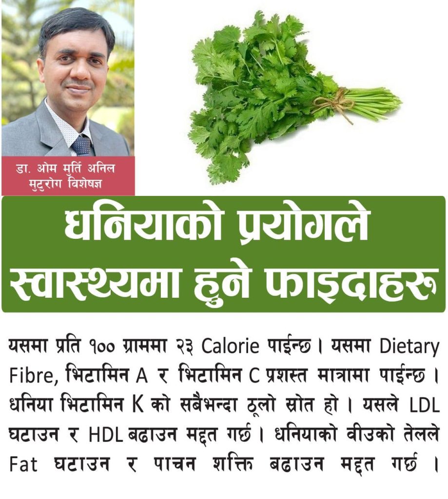 धनियाँमा प्रति १०० ग्राममा २३ क्यालोरी पाइन्छ । यसमा Dietary fibre, भिटामिन ‘ए’ भिटामिन ‘सि’ प्रशस्त मात्रामा पाइन्छ । धनियाँ भिटामिन ‘के’ को प्रमुख स्रोत हो । यसले ‘एलडिएल’ घटाउन र ‘एचडिएल’ बढाउन सहयोग गर्दछ । धनियाँको वीउको तेलले फ्याट घटाउन र पाचन शक्ति बढाउन समेत मद्धत गर्दछ ।
