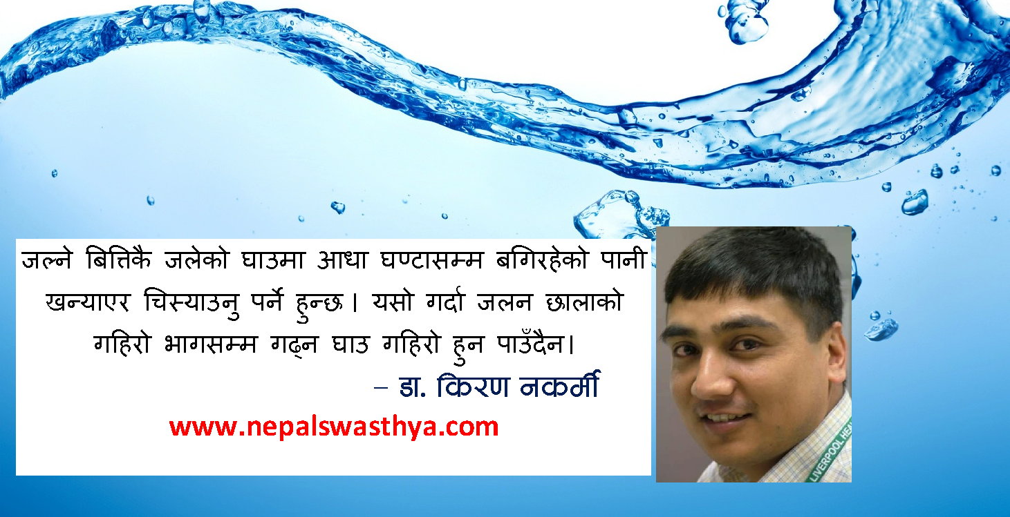 जल्ने बित्तिकै जलेको घाउमा आधा घण्टा सम्म बगिरहेको पानी खन्याएर चिस्याउनु पर्ने हुन्छ। यसो गर्दा जलन छालाको गहिरो भागसम्म गढ्न घाउ गहिरो हुन पाउँदैन। गहिरो घाउलाई छाला प्रत्यारोपण गर्नुपर्छ भने चिस्याएर घाउ गहिरो हुन दिएन भने मलहम पट्टी गरेरै बिना अपरेशन निको पार्न सकिने सम्भावना बढ्न जान्छ।