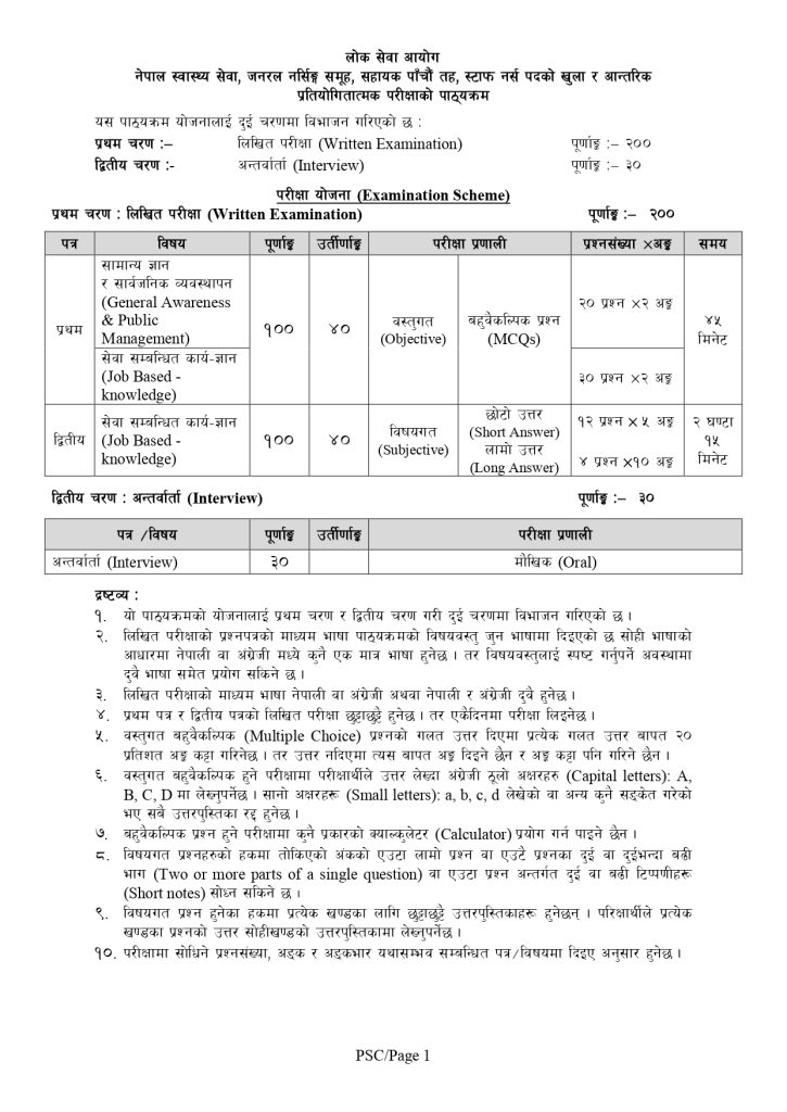 नेपाल स्वास्थ्य सेवा अन्तर्गत पर्ने जनरल नर्सिङ समूह, पाँचौ तहको स्टाफ नर्स पदका लागि संघीय लोकसेवा आयोगले लिने परीक्षामा उत्तिर्ण हुनको लागि दुईवटा चरण पार गर्नुपर्ने हुन्छ । जसको लागि पहिलो चरणमा लिखित परीक्षा हुन्छ भने दोस्रो चरणमा अन्तर्वार्ता हुने गर्दछ । पहिलो चरणको लागि सामान्य ज्ञान साथै सार्वजनिक व्यवस्थापन र सेवा सम्बन्धी कार्य ज्ञानको परीक्षा दिनुपर्ने हुन्छ । यो वस्तुगत हुनेछ भने दोस्रो चरणमा विषयगतको परीक्षा दिनुपर्दछ । जसमा सेवा सम्बन्धी कार्य ज्ञान नै रहेको हुन्छ ।